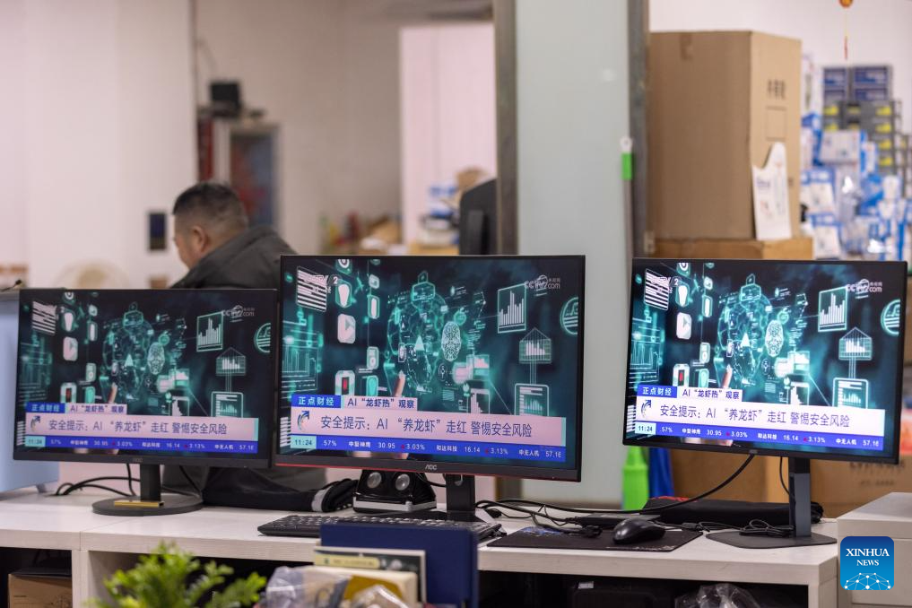 This photo taken on March 11, 2026 shows computer screens displaying a news report on the open-source AI agent OpenClaw at a shopping center for digital gadgets in Wuxing District of Huzhou City, east China's Zhejiang Province. "Raising lobster" and one-person companies (OPCs), which have sparked heated discussions in China's AI community and among the public, are also hot topics at the country's ongoing "two sessions" this year.