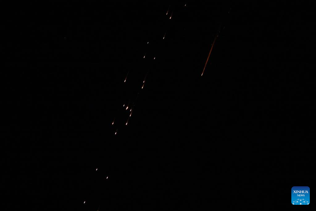 Debris falls after a missile has been hit by interceptor missiles launched from Israeli air defense systems over Jerusalem, March 9, 2026. (Photo by Jamal Awad/Xinhua)