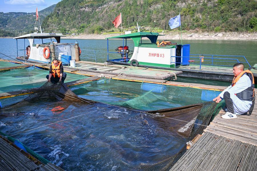 CHONGQING, March 10 (Xinhua) -- The Dazhou base of the fisheries research institute of Wanzhou District serves as a wild acclimation center for the rare fish species in the upper reaches of the Yangtze River. Equipped with 32 net cages covering an area of approximately 800 square meters, the base conserves over 20 rare and commercial fish species. Its annual output of rare and high-quality fish fry exceeds 20 million.