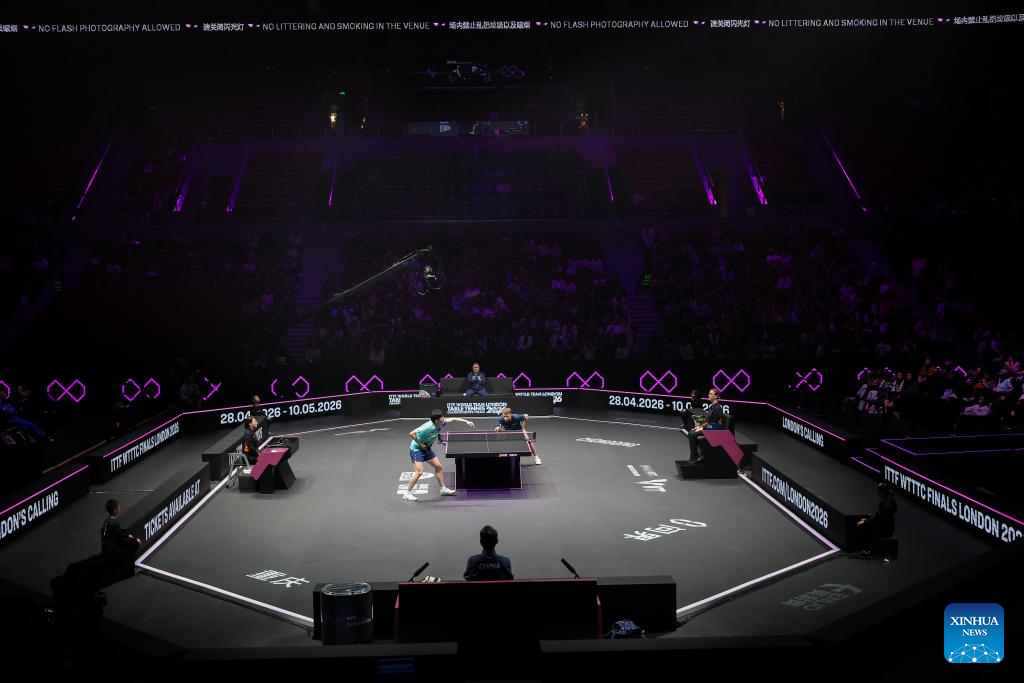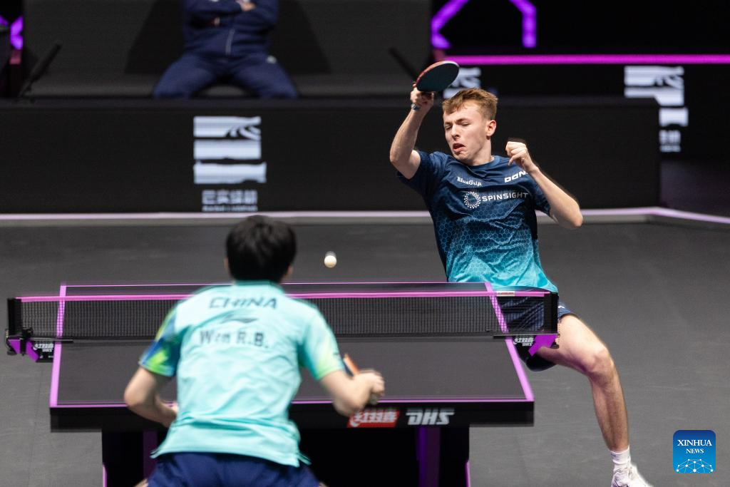 Wen Ruibo (R) of China hits a return during the men's singles round of 32 match against Flavien Coton of France at the WTT Champions Chongqing 2026 in southwest China's Chongqing, March 10, 2026. (Xinhua/Huang Wei)
