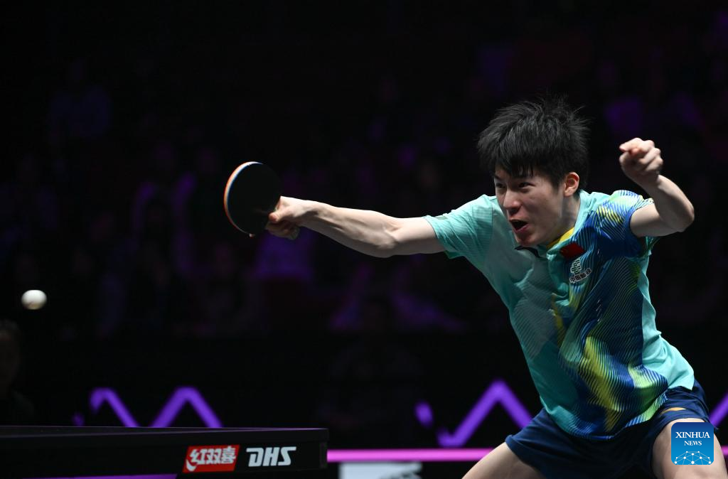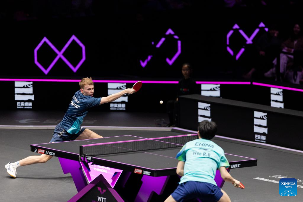 Wen Ruibo (L) of China hits a return during the men's singles round of 32 match against Flavien Coton of France at the WTT Champions Chongqing 2026 in southwest China's Chongqing, March 10, 2026. (Xinhua/Chen Cheng)