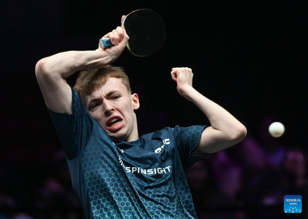Flavien Coton of France hits a return during the men's singles round of 32 match against Wen Ruibo of China at the WTT Champions Chongqing 2026 in southwest China's Chongqing, March 10, 2026. (Xinhua/Chen Cheng)