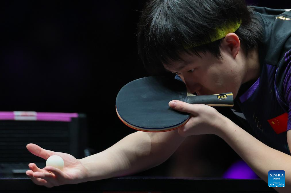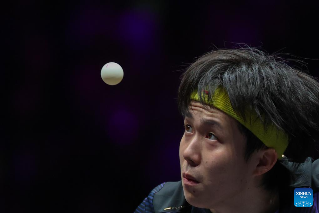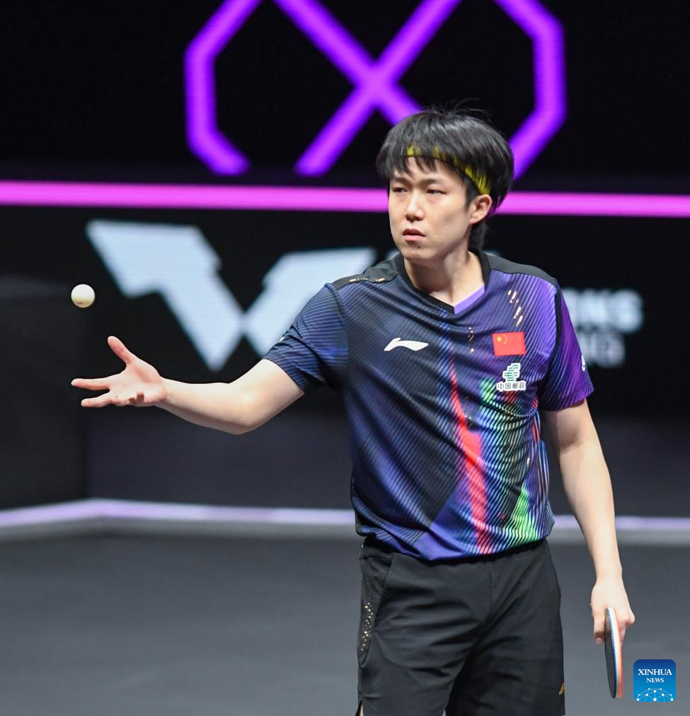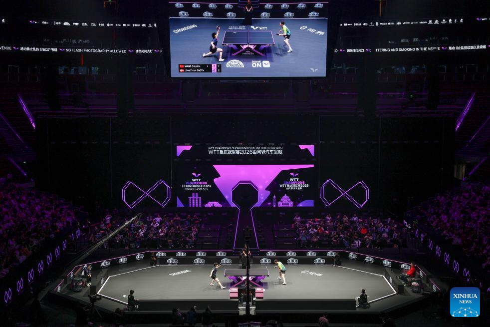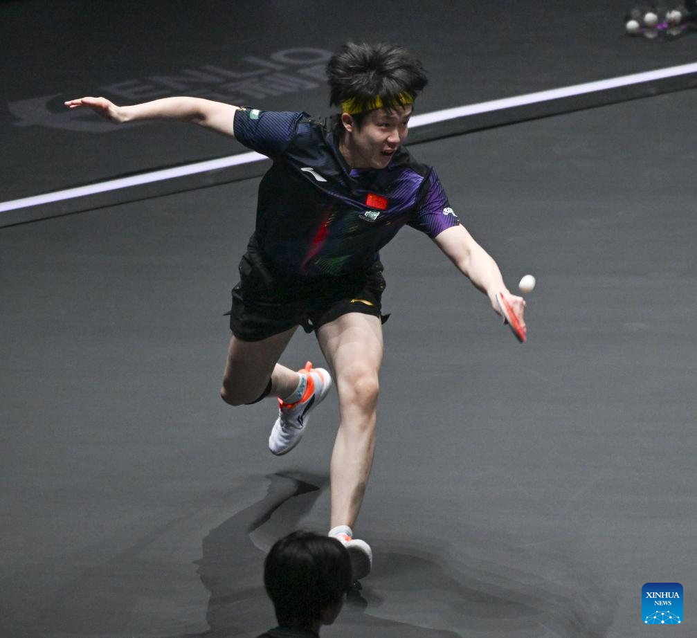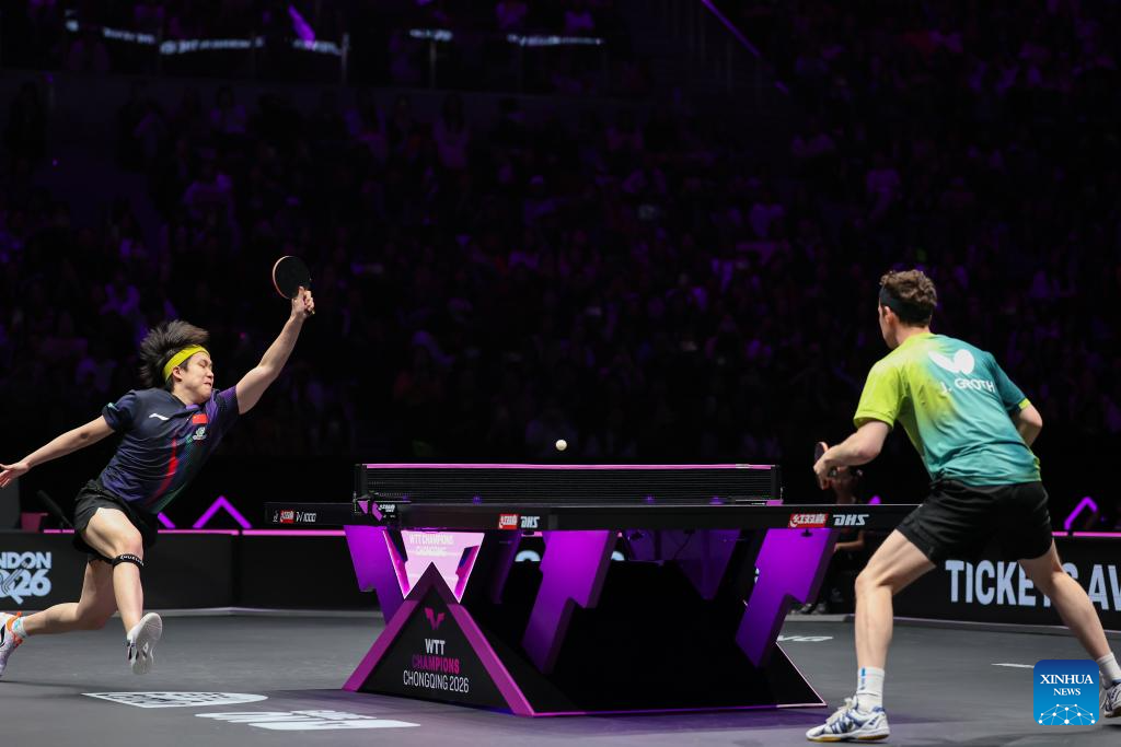 Wang Chuqin (L) hits a return during the men's singles round of 32 match between Wang Chuqin of China and Jonathan Groth of Denmark at the WTT Champions Chongqing 2026 in southwest China's Chongqing, March 11, 2026. (Xinhua/Huang Wei)