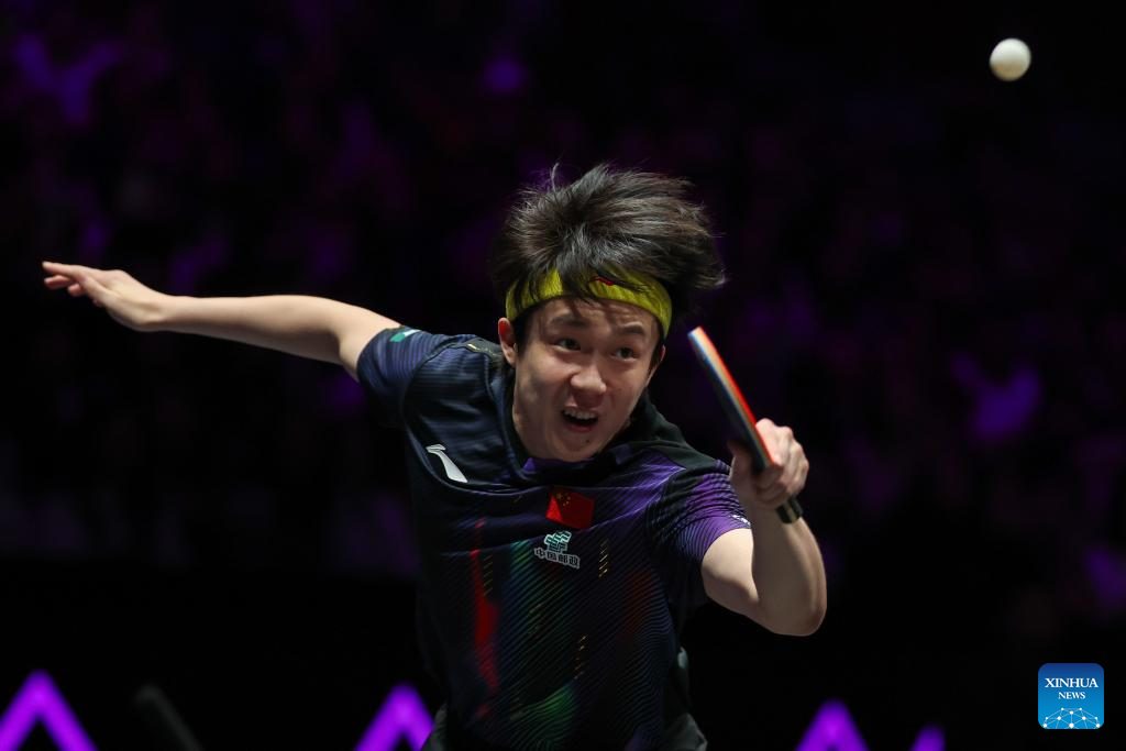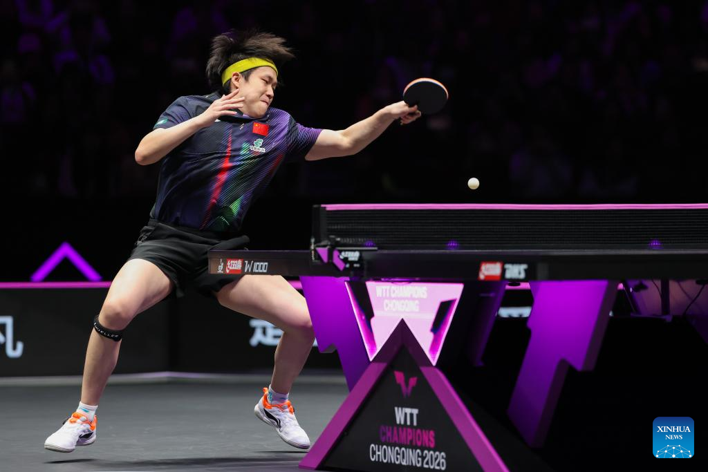 Wang Chuqin hits a return during the men's singles round of 32 match between Wang Chuqin of China and Jonathan Groth of Denmark at the WTT Champions Chongqing 2026 in southwest China's Chongqing, March 11, 2026. (Xinhua/Chen Cheng)