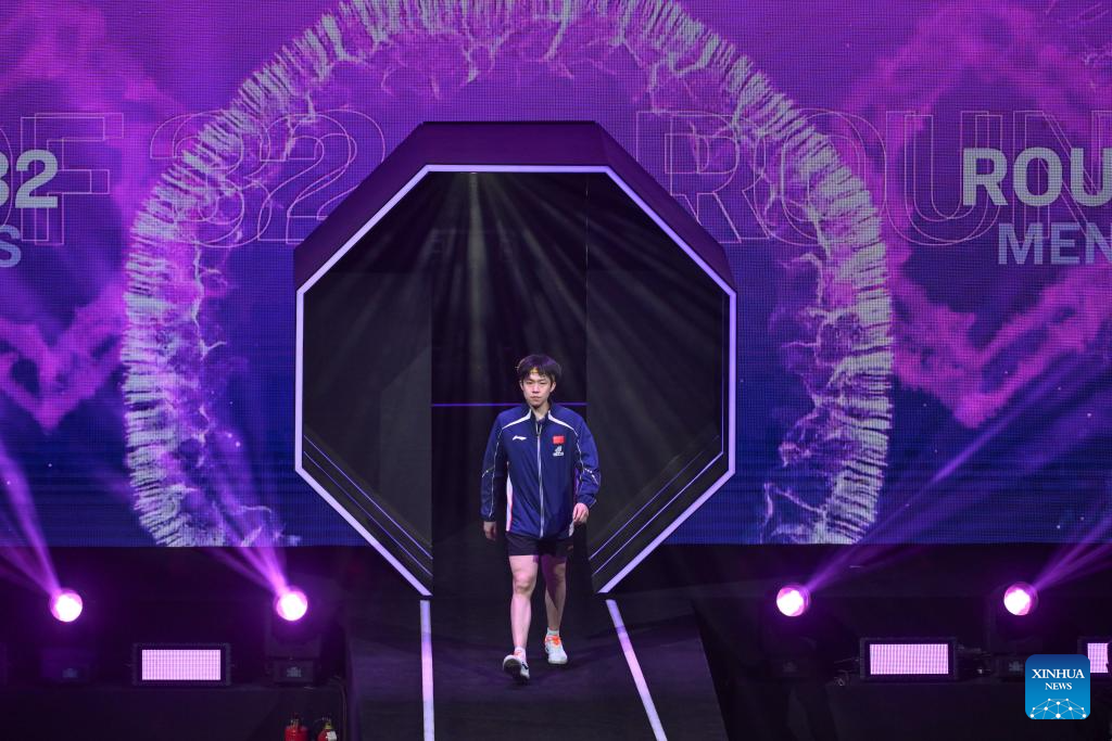 Wang Chuqin enters the court before the men's singles round of 32 match between Wang Chuqin of China and Jonathan Groth of Denmark at the WTT Champions Chongqing 2026 in southwest China's Chongqing, March 11, 2026. (Xinhua/Chen Cheng)