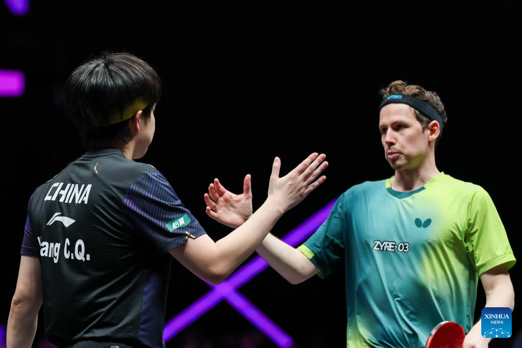 Wang Chuqin (L) greets Jonathan Groth after the men's singles round of 32 match between Wang Chuqin of China and Jonathan Groth of Denmark at the WTT Champions Chongqing 2026 in southwest China's Chongqing, March 11, 2026. (Xinhua/Huang Wei)