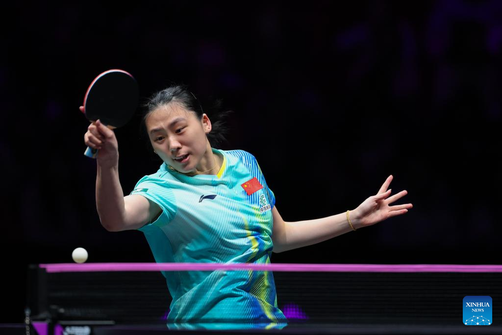 Chen Yi hits a return during the women's singles round of 32 match between Chen Yi of China and Kim Nayeong of South Korea at the WTT Champions Chongqing 2026 in southwest China's Chongqing, March 11, 2026. (Xinhua/Huang Wei)