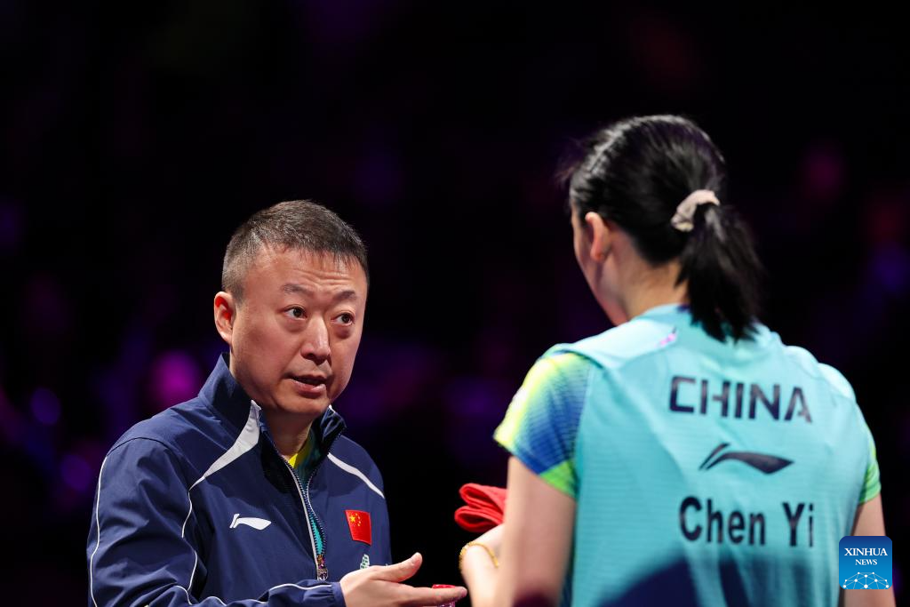 Chen Yi (R) communicates with coach Ma Lin during the women's singles round of 32 match between Chen Yi of China and Kim Nayeong of South Korea at the WTT Champions Chongqing 2026 in southwest China's Chongqing, March 11, 2026. (Xinhua/Huang Wei)