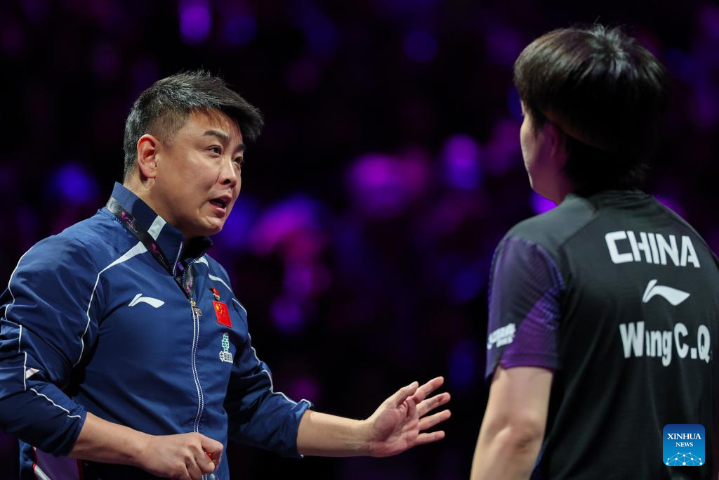 Wang Chuqin (R) communicates with coach Wang Hao during the men's singles round of 32 match between Wang Chuqin of China and Jonathan Groth of Denmark at the WTT Champions Chongqing 2026 in southwest China's Chongqing, March 11, 2026. (Xinhua/Huang Wei)