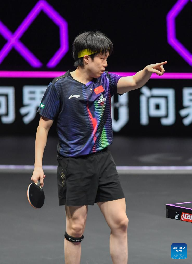 Wang Chuqin reacts during the men's singles round of 32 match between Wang Chuqin of China and Jonathan Groth of Denmark at the WTT Champions Chongqing 2026 in southwest China's Chongqing, March 11, 2026. (Xinhua/Tang Yi)