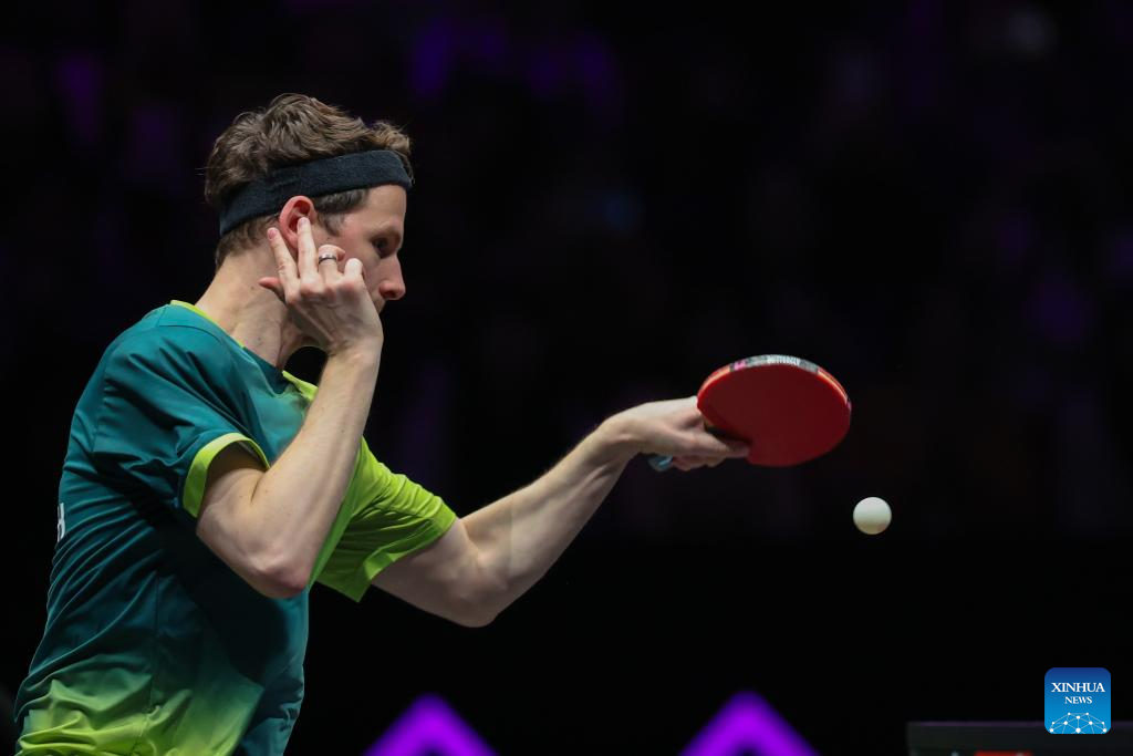 Jonathan Groth hits a return during the men's singles round of 32 match between Wang Chuqin of China and Jonathan Groth of Denmark at the WTT Champions Chongqing 2026 in southwest China's Chongqing, March 11, 2026. (Xinhua/Huang Wei)