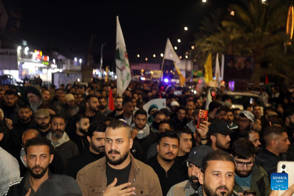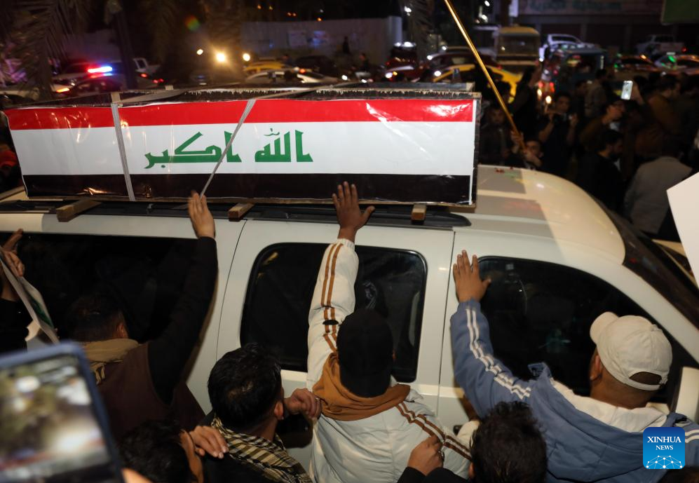 People attend a funeral for deceased Iraqi paramilitary Popular Mobilization Forces (PMF) members in Baghdad, Iraq, on March 12, 2026. Airstrikes on the 19th Brigade headquarters in Akashat near the Syrian border in Iraq's Anbar province killed at least 32 personnel belonging to the PMF and wounded 65 others on Thursday Morning, a provincial security source told Xinhua on condition of anonymity. (Xinhua/Khalil Dawood)