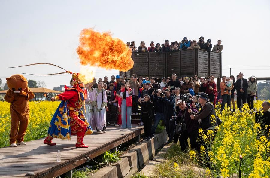 Magnolia blossoms are pictured with fish in the background at the Heyuan scenic spot in Yangzhou City, east China's Jiangsu Province, March 10, 2026. (Photo by Meng Delong/Xinhua)A Sichuan Opera artist performs for tourists in a rapeseed flower field in Jiuchi Town of Chengdu City, southwest China's Sichuan Province, March 11, 2026. (Photo by Luo Guoyang/Xinhua)A drone photo taken on March 10, 2026 shows tour boats sailing on Wujiang River near Gongtan Ancient Town in Youyang Tujia and Miao Autonomous County, southwest China's Chongqing Municipality. (Photo by Qiu Hongbin/Xinhua)A drone photo taken on March 8, 2026 shows tourists enjoying rapeseed flowers in Huaqiao Town of Guang'an City, southwest China's Sichuan Province. (Photo by Zhang Guosheng/Xinhua)Students paint from nature under the guidance of teachers in Hai'an City, east China's Jiangsu Province, March 12, 2026. (Photo by Gu Binbin/Xinhua)A bird is pictured among blossoms at a park in Xigang Town, Tengzhou City, east China's Shandong Province, March 12, 2026. (Photo by Li Zhijun/Xinhua)■