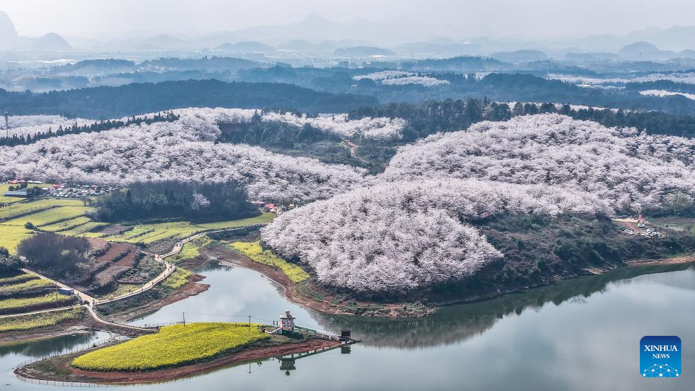An aerial drone photo taken on March 11, 2026 shows cherry blossoms in Gui'an New Area, southwest China's Guizhou Province. (Xinhua/Tao Liang)