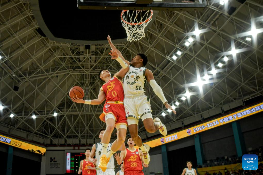 Lin Bingsheng (L, top) of Zhejiang Lions goes for a layup during the 24th round match between Zhejiang Lions and Nanjing Monkey Kings at the 2025-2026 season of the Chinese Basketball Association (CBA) league in Hangzhou, east China's Zhejiang Province, March 11, 2026. (Xinhua/Jiang Han)