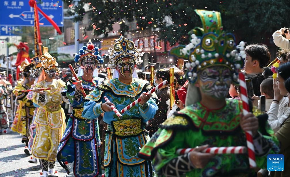A Yingge dance, or "dance to the hero's song," is staged during the Chenghuang temple fair in Jieyang, south China's Guangdong Province, March 11, 2026.