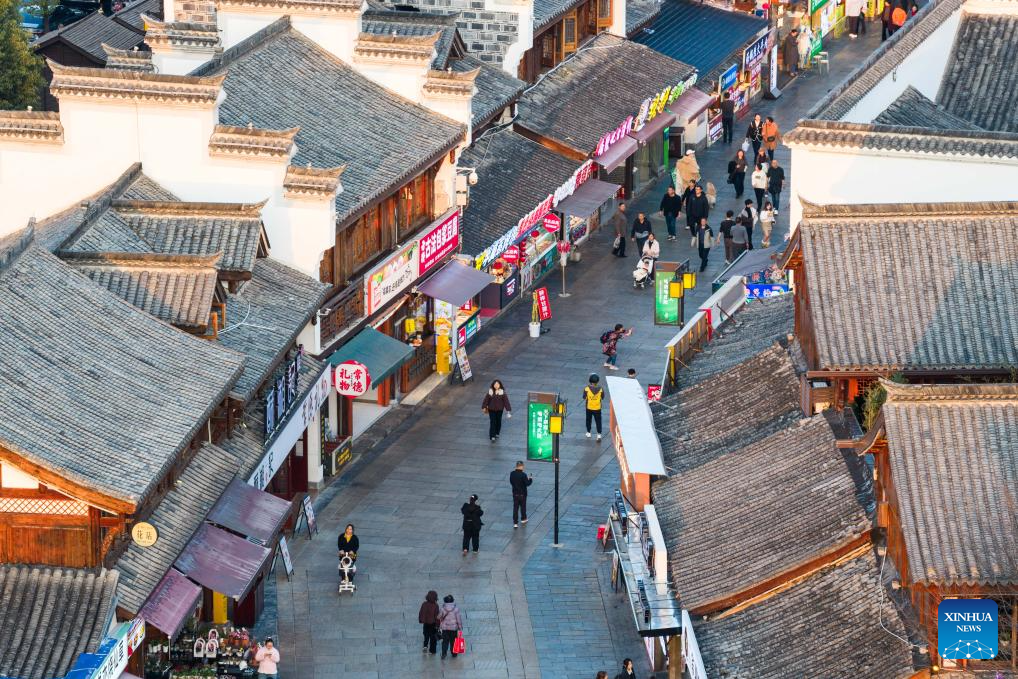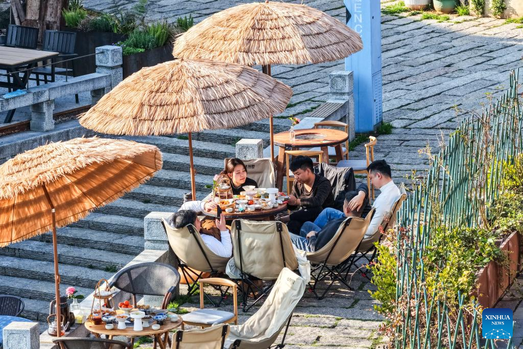 A drone photo shows people enjoying their leisure time at Changde Hejie along the Chuanzi River in Changde, central China's Hunan Province, March 11, 2026.
