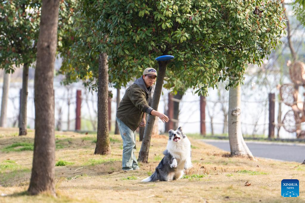 A man plays with his dog along the Chuanzi River in Changde, central China's Hunan Province, March 11, 2026.