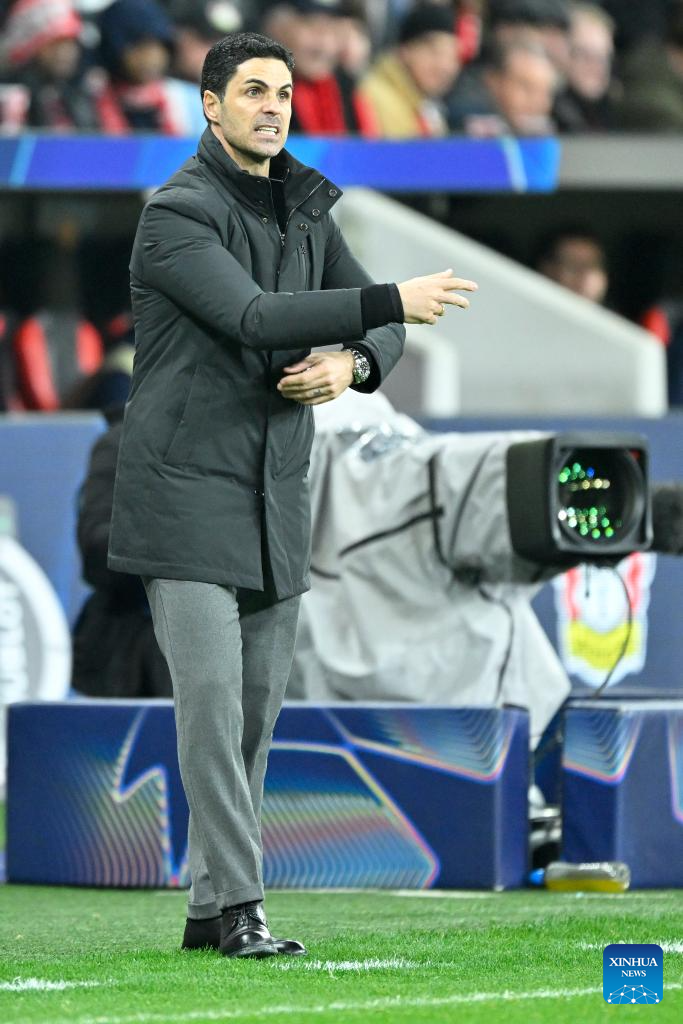 Arsenal's head coach Mikel Arteta reacts during the UEFA Champions League round of 16 first leg match between Bayer 04 Leverkusen and Arsenal in Leverkusen, Germany, March 11, 2026. (Photo by Ulrich Hufnagel/Xinhua)