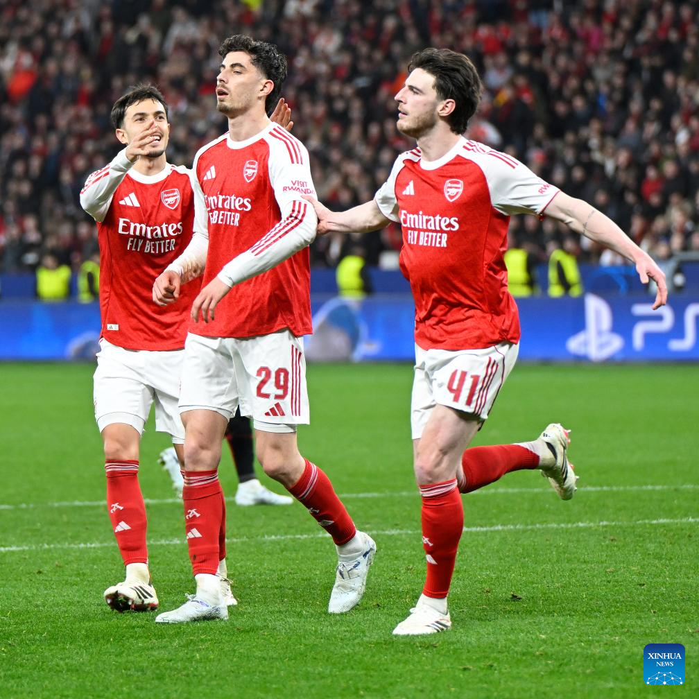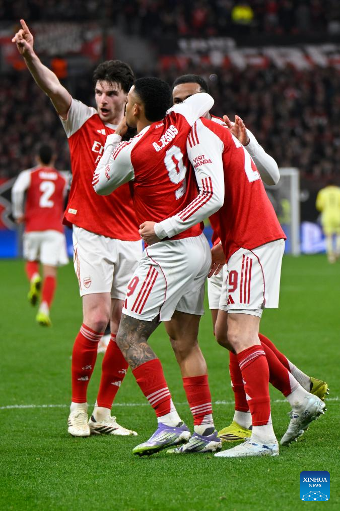 Players of Arsenal celebrate scoring during the UEFA Champions League round of 16 first leg match between Bayer 04 Leverkusen and Arsenal in Leverkusen, Germany, March 11, 2026. (Photo by Ulrich Hufnagel/Xinhua)