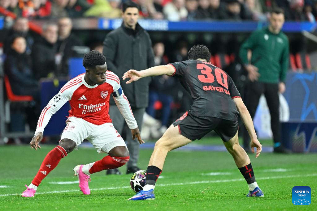 Ibrahim Maza (R) of Bayer 04 Leverkusen vies with Bukayo Saka of Arsenal during the UEFA Champions League round of 16 first leg match between Bayer 04 Leverkusen and Arsenal in Leverkusen, Germany, March 11, 2026. (Photo by Ulrich Hufnagel/Xinhua)