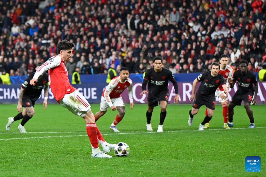 Kai Havertz (front) of Arsenal shoots to score during the UEFA Champions League round of 16 first leg match between Bayer 04 Leverkusen and Arsenal in Leverkusen, Germany, March 11, 2026. (Photo by Ulrich Hufnagel/Xinhua)