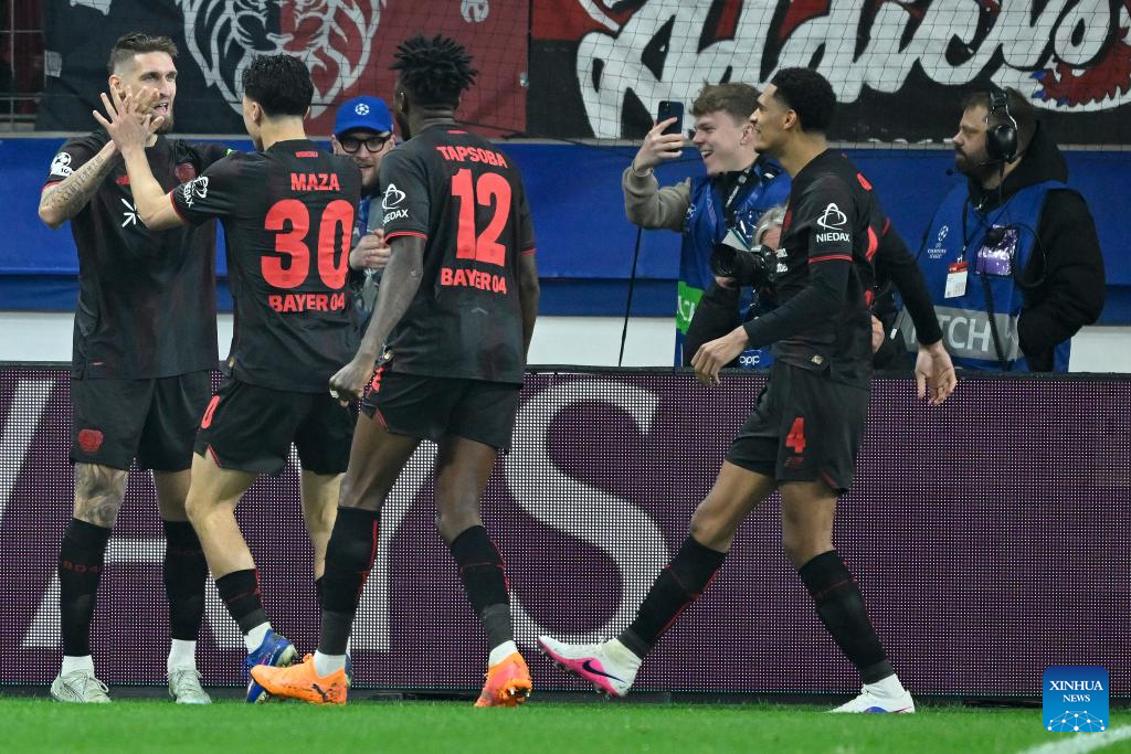 Players of Bayer 04 Leverkusen celebrate scoring during the UEFA Champions League round of 16 first leg match between Bayer 04 Leverkusen and Arsenal in Leverkusen, Germany, March 11, 2026. (Photo by Ulrich Hufnagel/Xinhua)