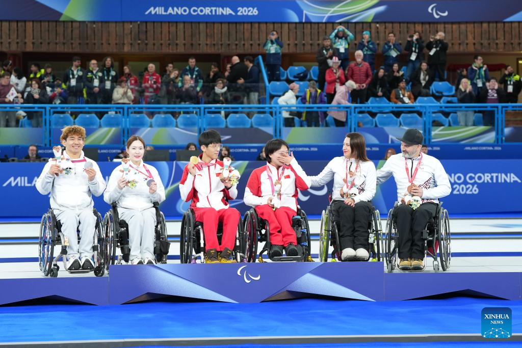 Gold medalists Yang Jinqiao (3rd L)/Wang Meng (3rd R) of China, silver medalists Lee Yongsuk (1st L)/Baek Hyejin (2nd L) of South Korea, and bronze medalists Polina Rozkova (2nd R)/Agris Lasmans of Latvia attend the awarding ceremony for the wheelchair curling mixed doubles event at the Milan-Cortina 2026 Paralympic Winter Games in Cortina D'ampezzo, Italy, March 11, 2026. (Xinhua/Lian Yi)