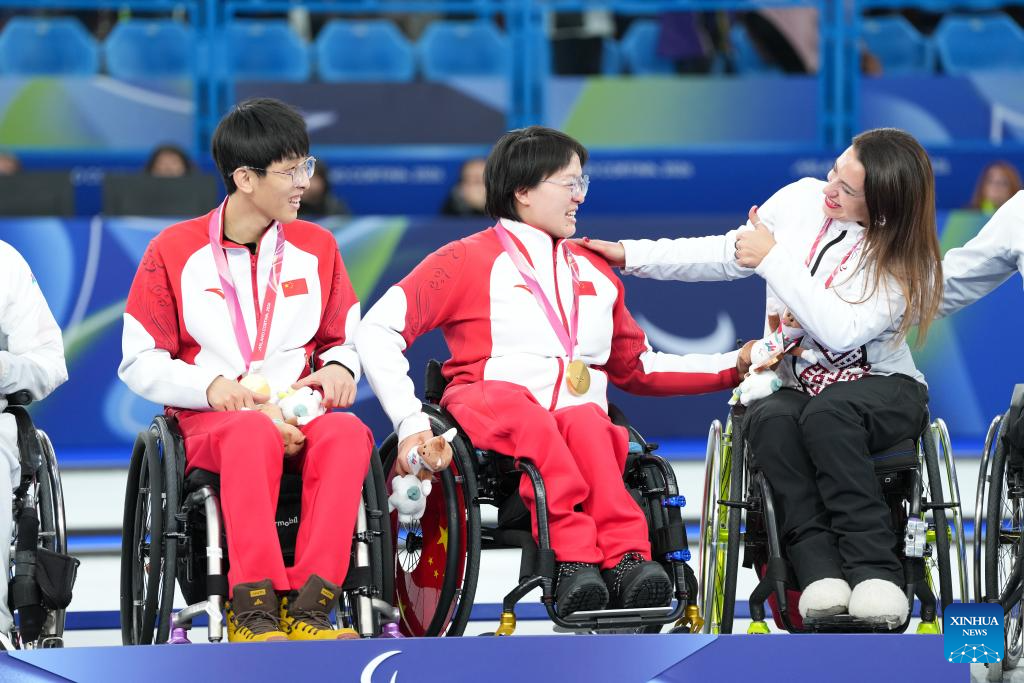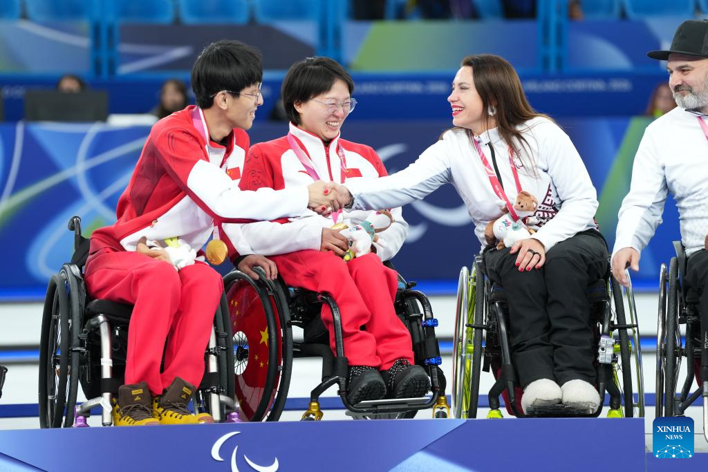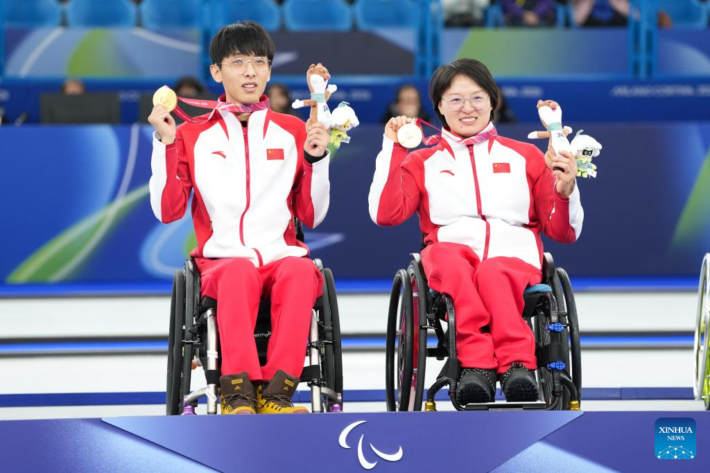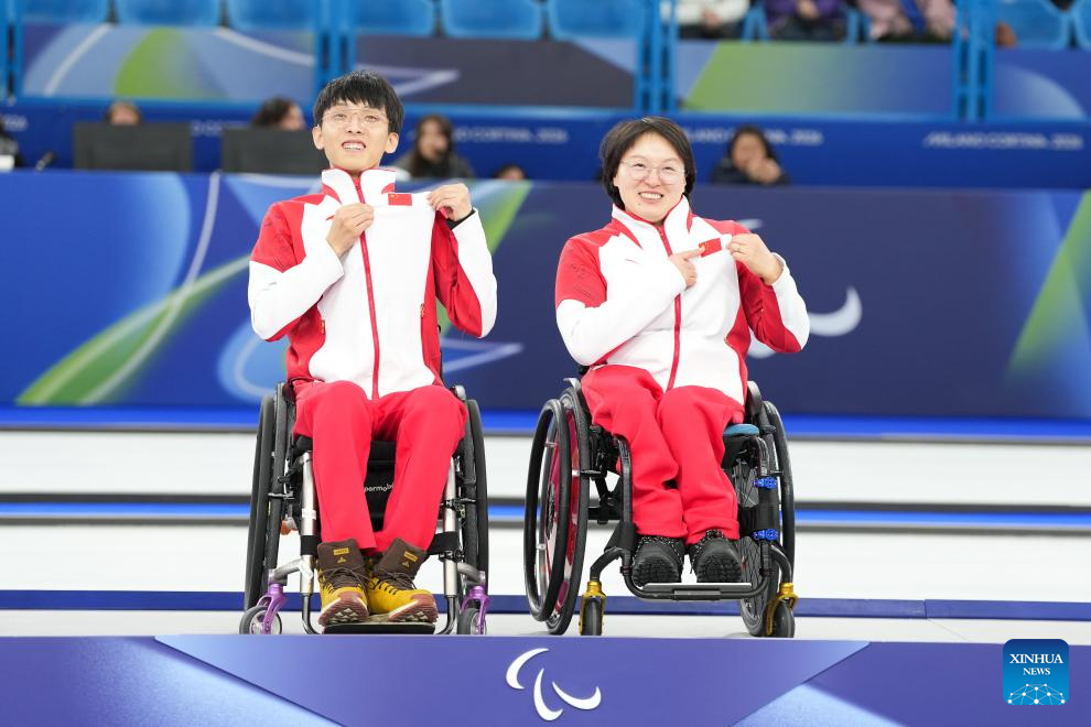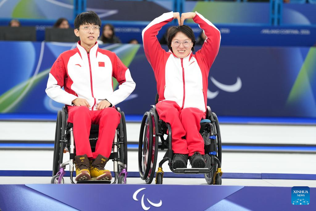 Gold medalists Yang Jinqiao (L)/Wang Meng of China pose during the awarding ceremony for the wheelchair curling mixed doubles event at the Milan-Cortina 2026 Paralympic Winter Games in Cortina D'ampezzo, Italy, March 11, 2026. (Xinhua/Lian Yi)