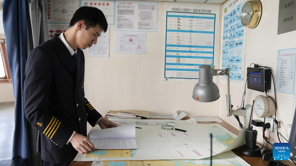Ro-ro passenger ship captain Huang Wanli prepares for sailing at the cab of the "Shuangtai 36" in Haikou, south China's Hainan Province, Feb. 3, 2026. (Xinhua/Xu Yushen)