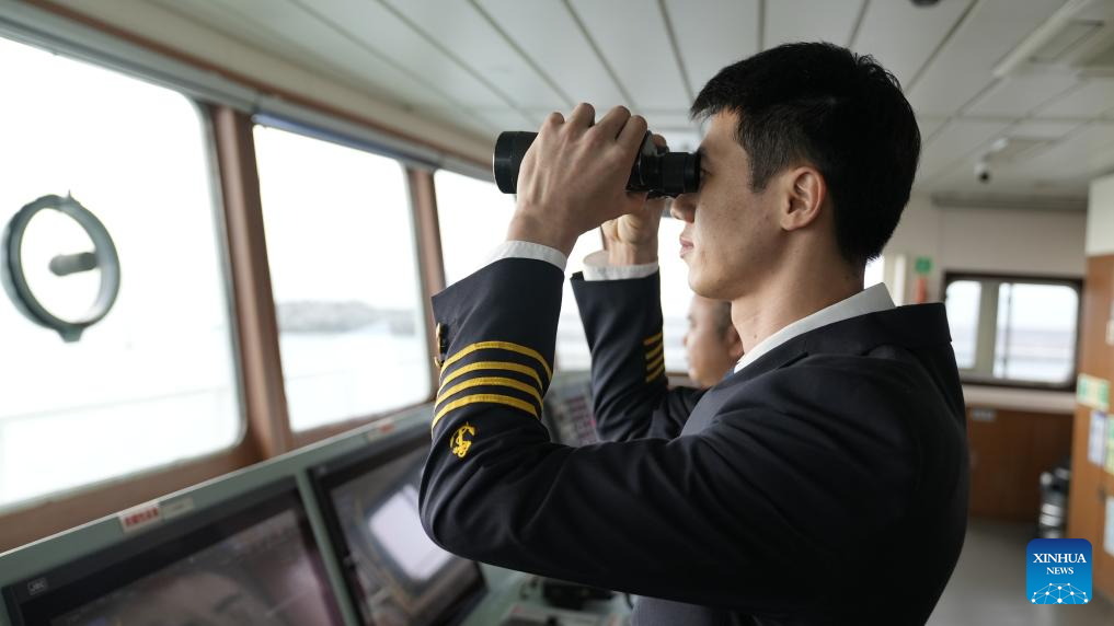 Ro-ro passenger ship captain Huang Wanli observes waters through binoculars in Haikou, south China's Hainan Province, Feb. 3, 2026. (Xinhua/Xu Yushen)