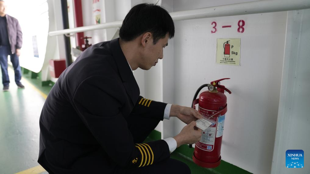 Ro-ro passenger ship captain Huang Wanli inspects fire-fighting equipment aboard in Haikou, south China's Hainan Province, Feb. 3, 2026. (Xinhua/Xu Yushen)