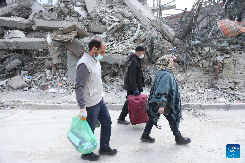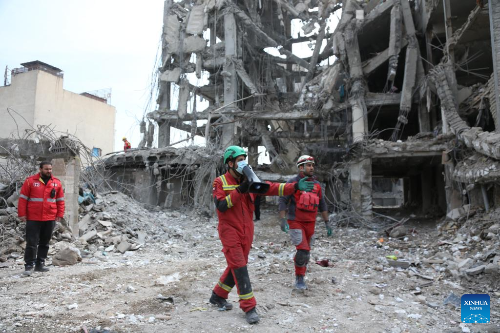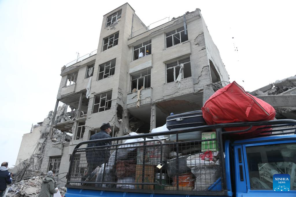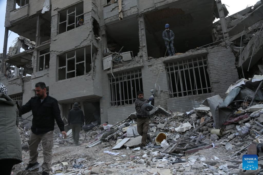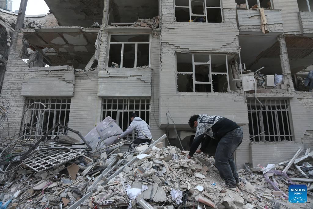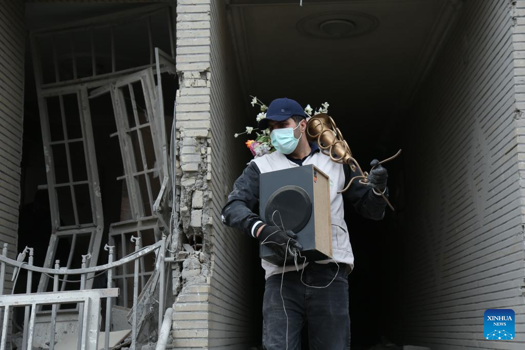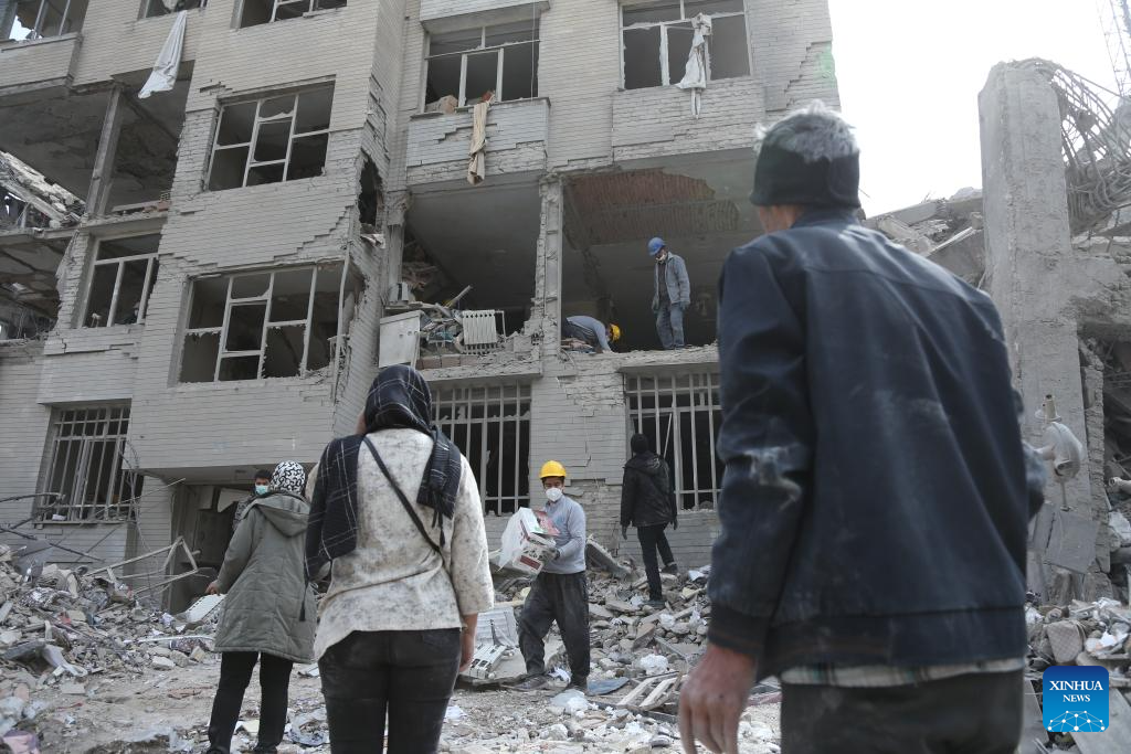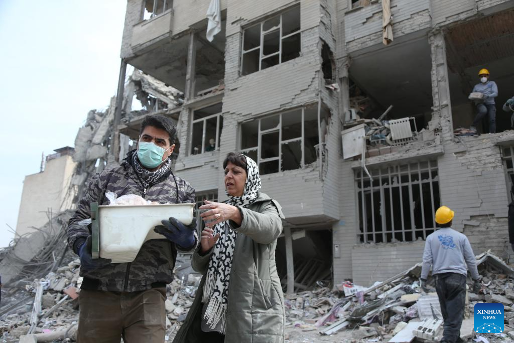 People search for daily necessities from damaged buildings in Tehran, Iran, March 12, 2026. (Xinhua/Shadati)