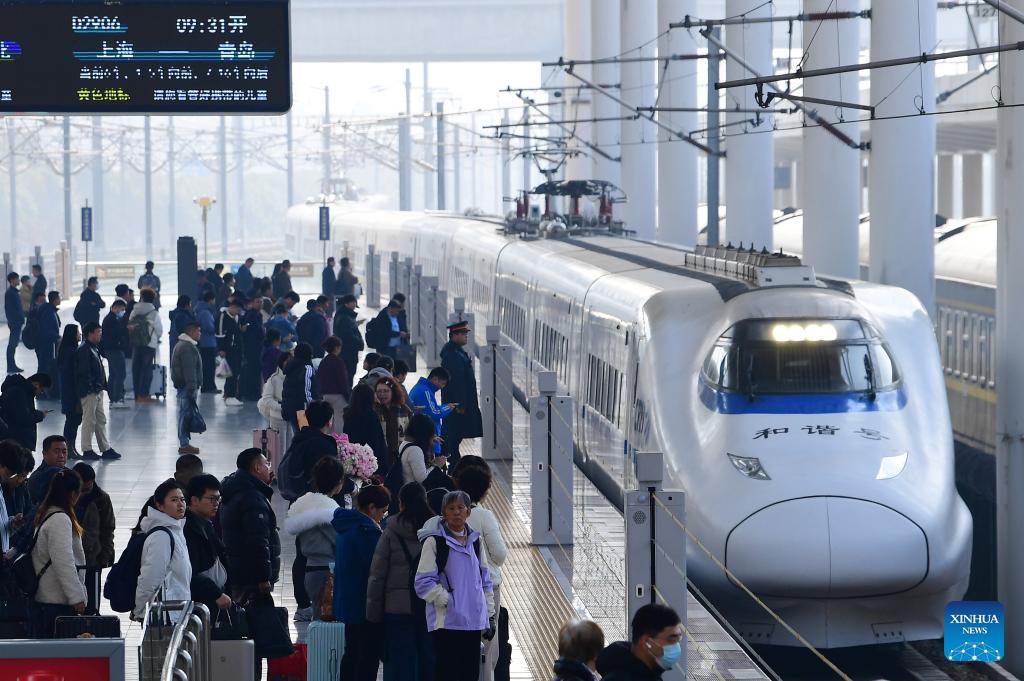 Passengers are seen at a platform of Tengzhou East Railway Station in Zaozhuang, east China's Shandong Province, March 13, 2026. The total number of inter-regional passenger trips across China during the 40-day Spring Festival travel rush, which concluded on Friday, is estimated to reach a record 9.4 billion, according to data from the Ministry of Transport. (Photo by Li Zongxian/Xinhua)