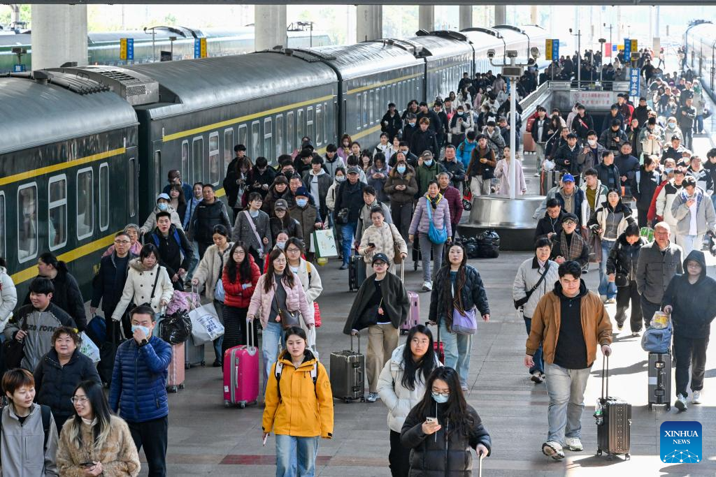 Passengers are seen at a platform of Nanjing Railway Station in Nanjing, east China's Jiangsu Province, March 13, 2026. The total number of inter-regional passenger trips across China during the 40-day Spring Festival travel rush, which concluded on Friday, is estimated to reach a record 9.4 billion, according to data from the Ministry of Transport. (Photo by Yang Suping/Xinhua)