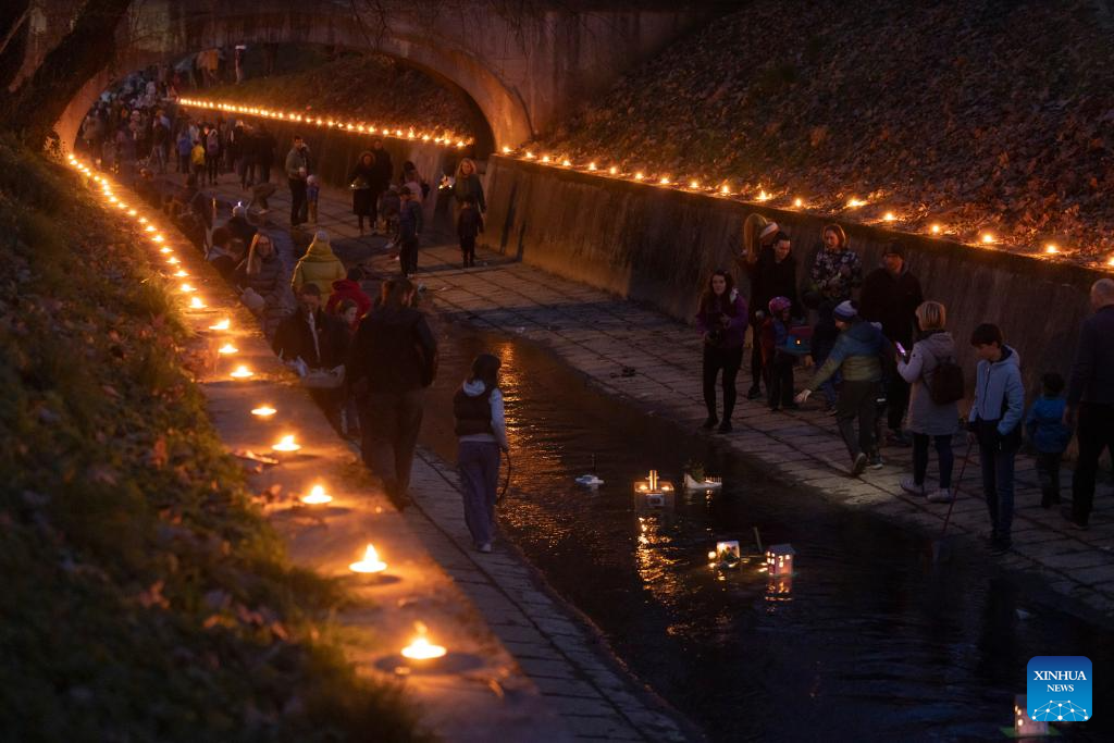 People watch their floats going down a stream to celebrate the arrival of spring in Ljubljana, Slovenia, March 11, 2026. According to the Slovenian old calendar, March 12 marks the start of spring. It is a local tradition to send off floats downstream on March 11 to celebrate spring's arrival. (Photo by Zeljko Stevanic/Xinhua)