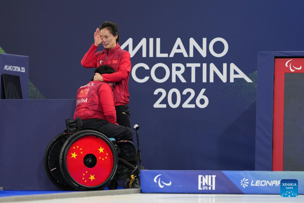 Coach Ru Xia (R) of China sheds tears and hugs Wang Meng after winning the wheelchair curling mixed doubles gold medal game between China and South Korea at the Milan-Cortina 2026 Paralympic Winter Games in Cortina D'ampezzo, Italy, March 11, 2026. (Xinhua/Lian Yi)