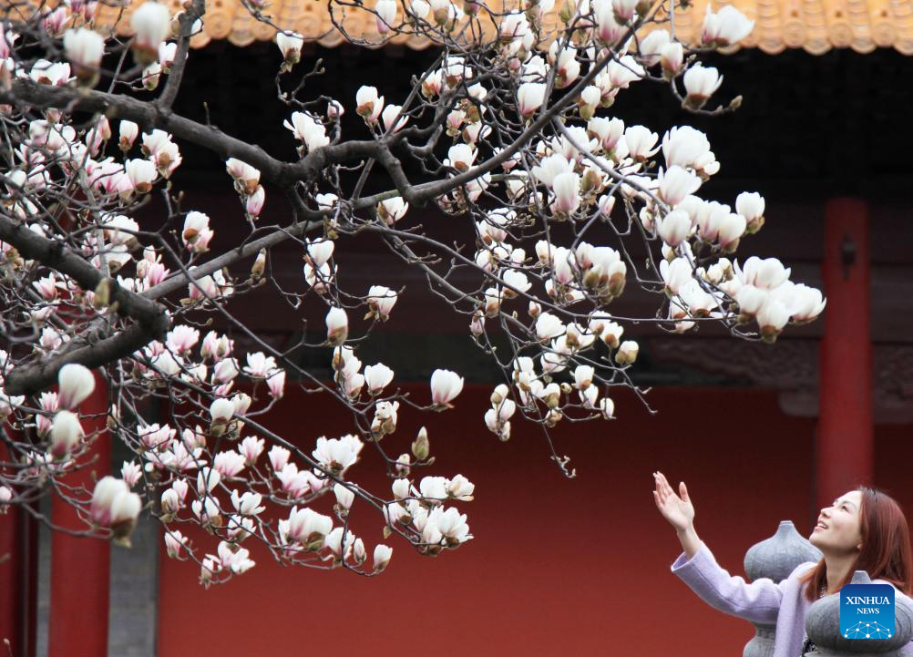 A tourist is pictured with magnolia blossoms in Nanjing, east China's Jiangsu Province, March 8, 2026. (Photo by Liu Jianhua/Xinhua)