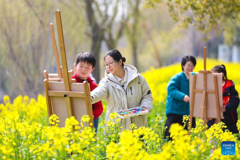 Students paint from nature under the guidance of teachers in Hai'an City, east China's Jiangsu Province, March 12, 2026. (Photo by Gu Binbin/Xinhua)
