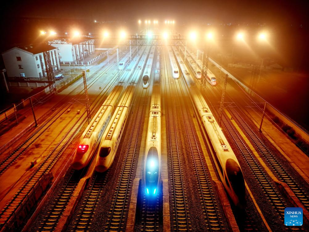 A drone photo taken on March 13, 2026 shows bullet trains waiting for departure at Lianyungang Railway Station in Lianyungang, east China's Jiangsu Province. The 2026 Spring Festival travel rush comes to an end on Friday. (Photo by Wang Chun/Xinhua)