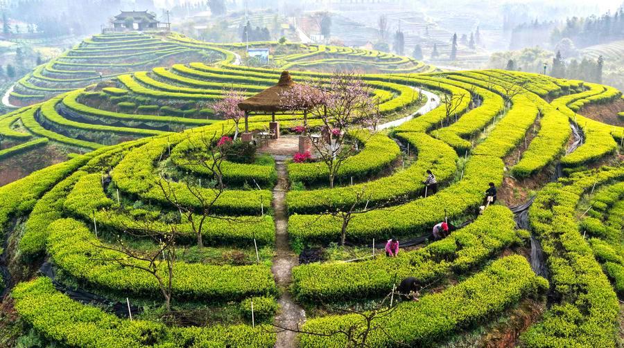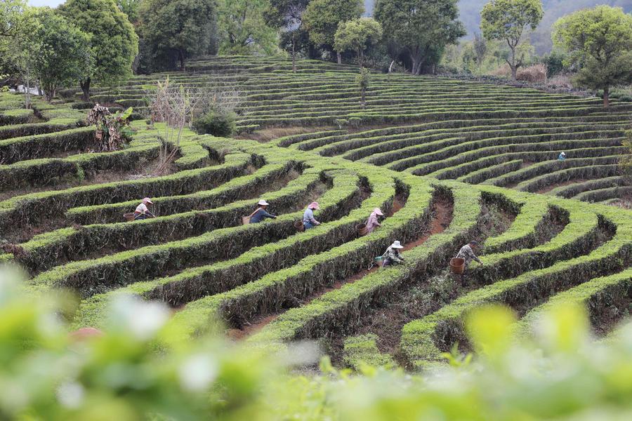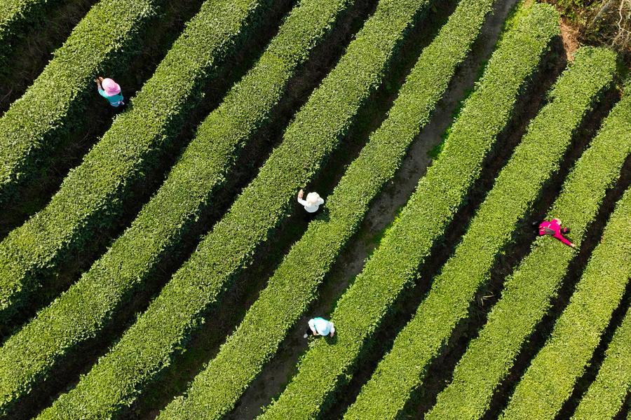 BEIJING, March 13 (Xinhua) -- In early spring, lush tea gardens stretch over the hills, dotted with busy tea pickers, forming picturesque scenes across China.