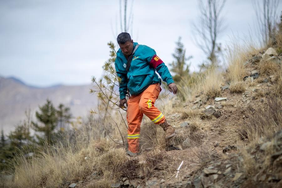 LHASA, March 13 (Xinhua) -- Tashi Chophel crouched beside a thin-tall pine, pulling aside a few weeds. "This is a 'third-generation' sapling, three years old," he said.