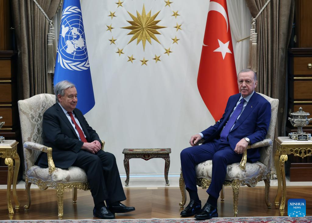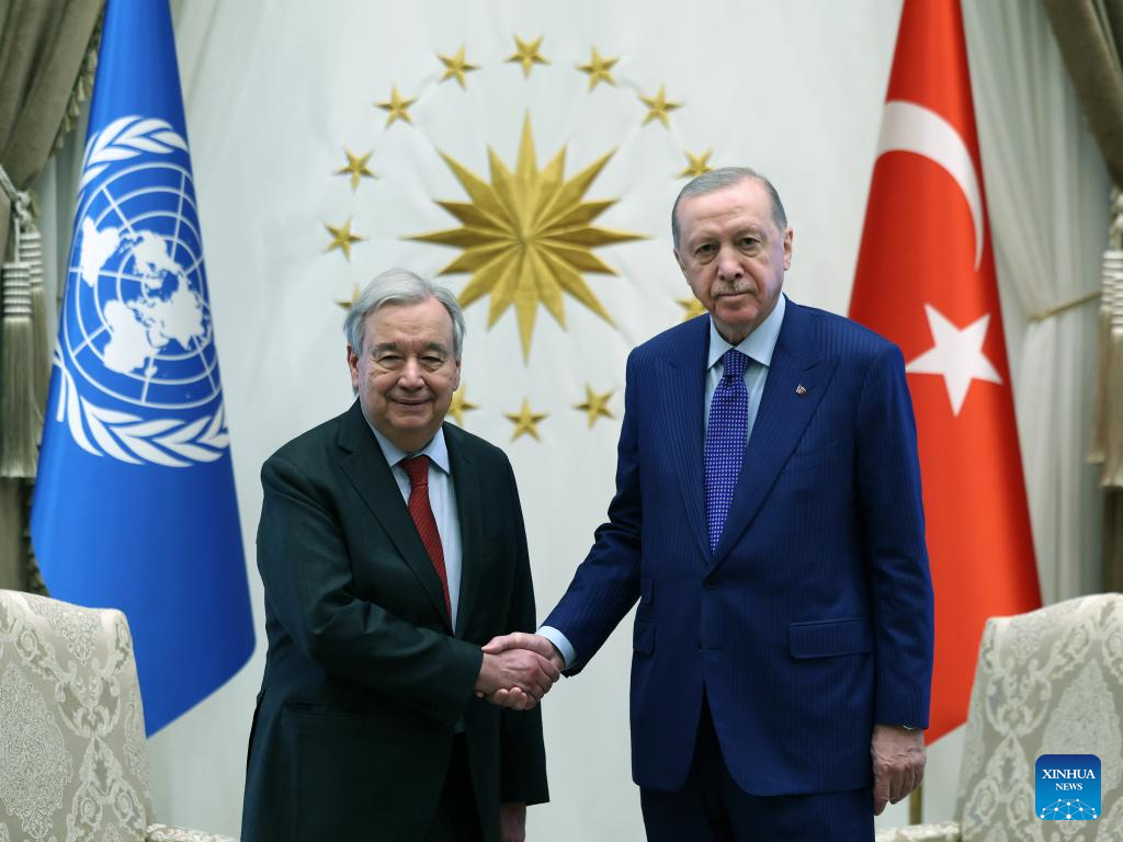 Turkish President Recep Tayyip Erdogan (R) meets with visiting UN Secretary-General Antonio Guterres at the presidential complex in Ankara, Türkiye, March 12, 2026. (Mustafa Kaya/Handout via Xinhua)