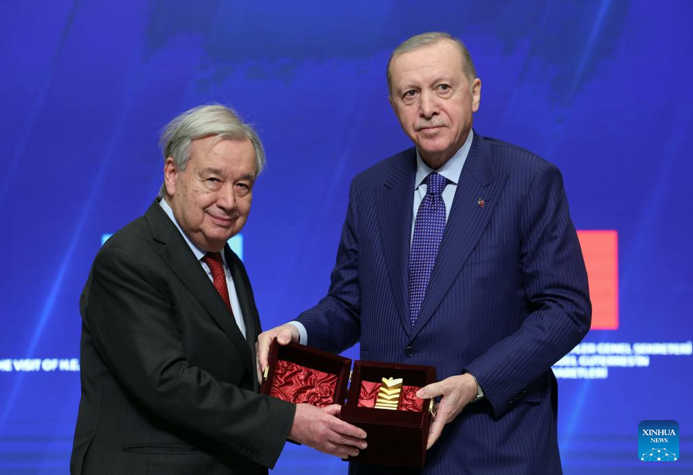 Turkish President Recep Tayyip Erdogan (R) presents the Ataturk International Peace Award to UN Secretary-General Antonio Guterres at the presidential complex in Ankara, Türkiye, March 12, 2026. (Mustafa Kaya/Handout via Xinhua)