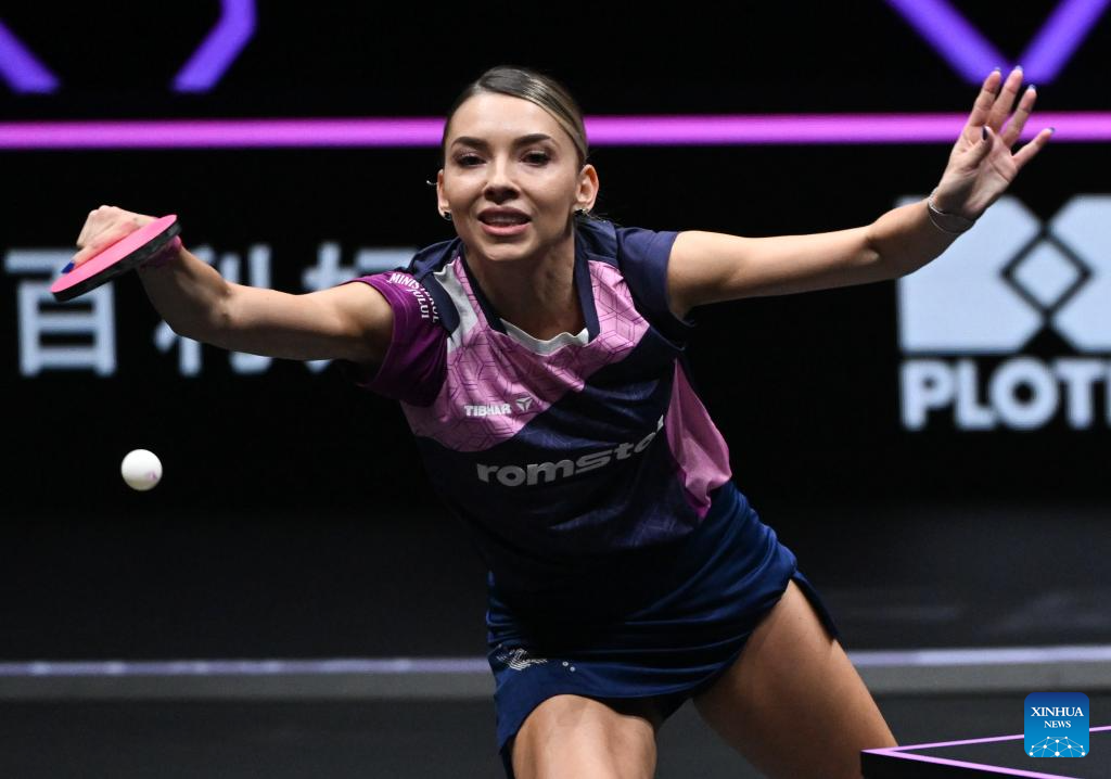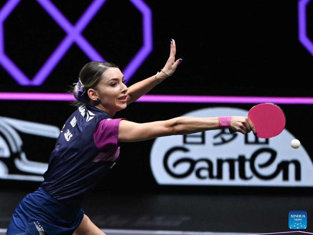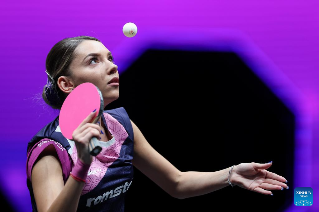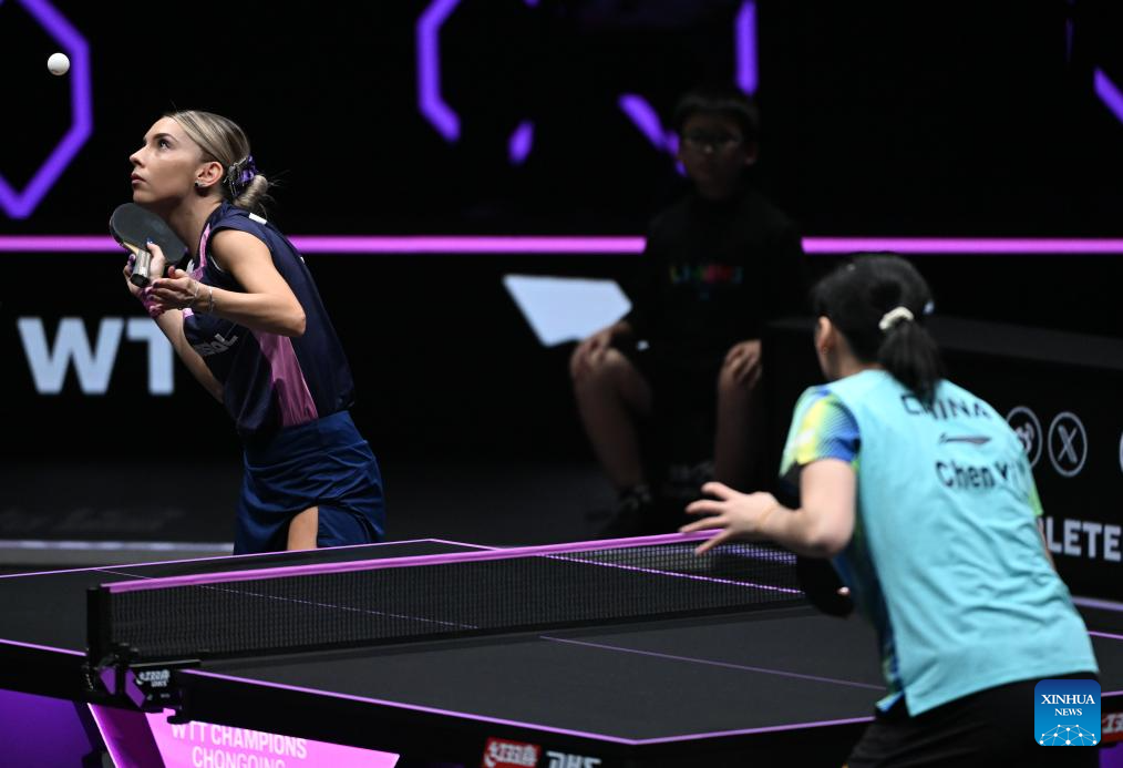 Bernadette Szocs of Romania hits a return during the women's singles round of 16 match against Chen Yi of China at the WTT Champions Chongqing 2026 in southwest China's Chongqing, March 13, 2026. (Xinhua/Chen Cheng)