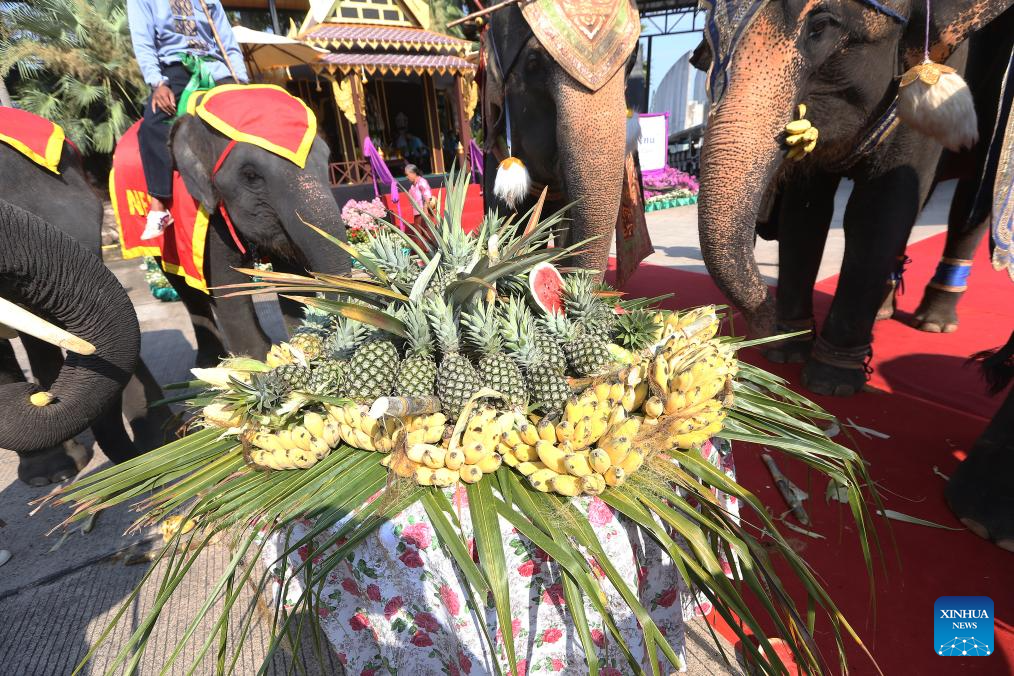 Elephants eat fruits during an event celebrating the Thai National Elephant Day at Nong Nooch Tropical Garden in Pattaya, Thailand, March 13, 2026. Thai National Elephant Day is celebrated on March 13 annually in Thailand. Various activities are held to raise public awareness of the elephants. (Xinhua/Rachen Sageamsak)