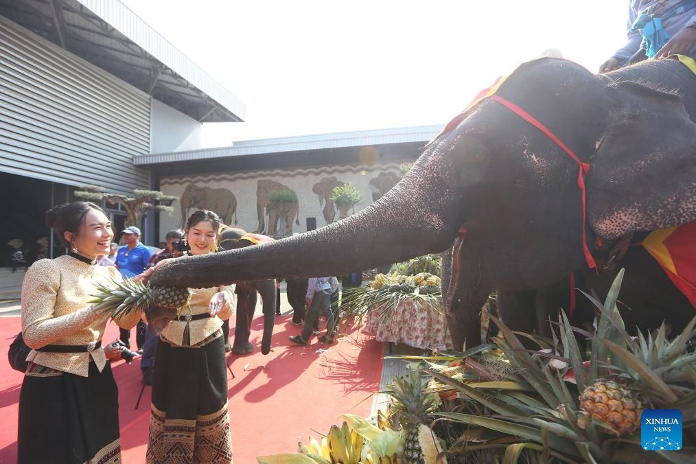 People feed elephants during an event celebrating the Thai National Elephant Day at Nong Nooch Tropical Garden in Pattaya, Thailand, March 13, 2026. Thai National Elephant Day is celebrated on March 13 annually in Thailand. Various activities are held to raise public awareness of the elephants. (Xinhua/Rachen Sageamsak)