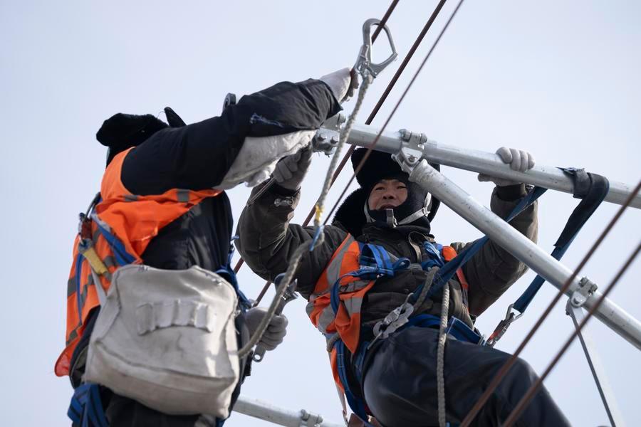 Workers install catenary systems at the construction site of Suihua South Station of the Harbin-Yichun high-speed railway in Suihua, northeast China's Heilongjiang Province, March 13, 2026. (Xinhua/Zhang Tao)