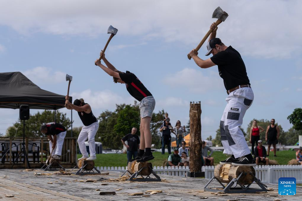 This photo taken on March 14, 2026 shows a wood chopping competition during the Kumeu show in Auckland, New Zealand. (Photo by Wu Jiaxiang/Xinhua)