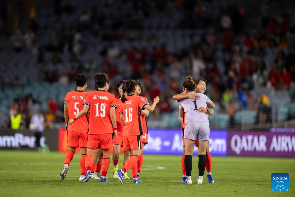 Players of South Korea celebrates after winning the quarterfinal of Women's Asian Cup between South Korea and Uzbekistan in Sydney, Australia, March 14, 2026. (Xinhua/Hu Jingchen)